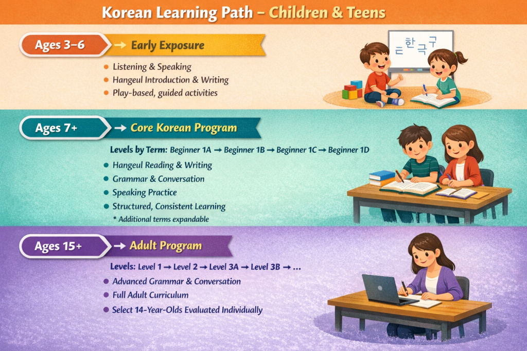 Eligibility: Our children’s courses are open to learners aged 3 to 14 and are designed to build a strong foundation in the Korean language and culture.